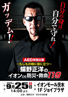 一般社団法人ニューワールドアワーズスポーツ救命協会代表理事で日本消防協会・消防応援団ならびに日本AED財団・AED大使を務める蝶野正洋さんが、9月25日(日)14:00より、イオンモール茨木1Fジョイプラザで、茨木市消防署協力のもと開催される『AED体験企画~もしもの時に役に立つ~蝶野正洋のイオンDE防災・救命119』に出演します(観覧無料)。是非、ご参加ください。