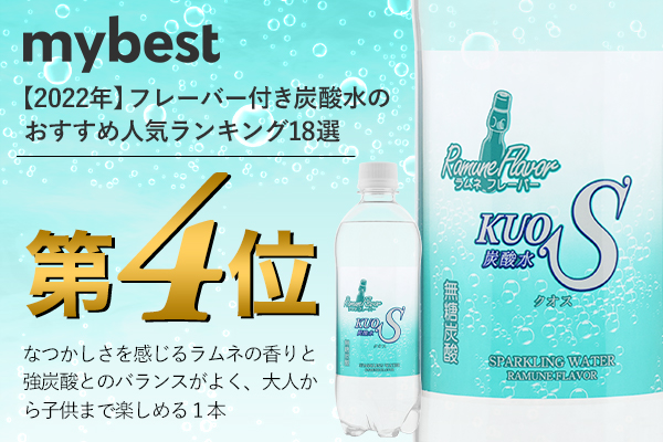 ランキングに選ばれた18選のうち、柑橘系フレーバーが多い中、他に見ない独自性のある『KUOS -クオス-ラムネフレーバー』が「強炭酸のバランスがよく、大人から子供まで楽しめる1本」としてmy best総合評価最上位に選ばれました。