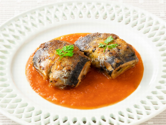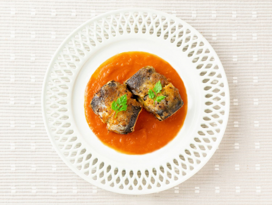 今回は、鳥取県境港市で獲れた新鮮な真イワシを使ったお料理です。この漁場で獲れた真イワシは脂も乗り、栄養価も高く評価されています。この料理は、生クリームで煮たクリーミーなほうれん草を包み、香り豊かな香草を混ぜたパン粉をまぶし、オーブンで焼き上げています。ほのかなガーリックの香りがトマトソースと混ざり合い抜群の相性を引き出しています。お皿にトマトソースを敷き、イワシを乗せて、お召し上がりください。キリッと冷やした白ワインとともにどうぞ。藤井シェフの本格フレンチをご自宅でお楽しみください。