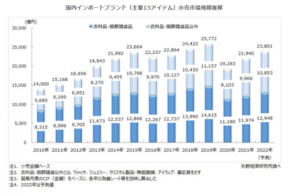 株式会社矢野経済研究所(代表取締役社長:水越孝)は、日本国内におけるインポートブランド市場を調査し、現況、ブランド動向、将来展望を明らかにした。