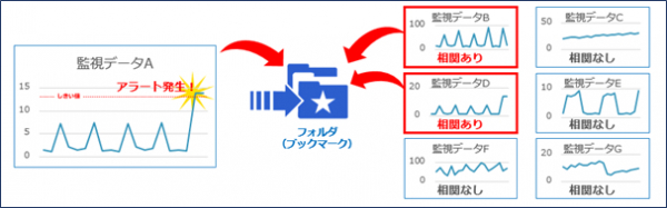ダイナミックブックマークとは、IT システムのアラートを契機に複数ある監視データの中から傾向が似ている監視データを抽出し、同じフォルダ(ブックマーク)に入れることで、一度に関連した監視データ(監視グラフ)を確認できる機能です。