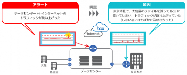 例えば以下のようなデータセンターに設置してあるネットワーク機器のトラフィック上昇アラートが発生した場合、一般的にはデータセンター内のネットワークの問題かどうかを運用者や管理者は最初に確認しますが、他拠点を含めたすべての監視データの相関を取得するため IT システム全体の環境を素早く把握でき、本例で言えば根本原因が東京本社でのトラフィックにあることを見抜くことができます。