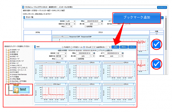 トラブルや切り分け原因候補の質問回答画面で選択した監視データ(グラフ)は、手順確認後に見直しや再度確認するためにフォルダ(ブックマーク)を作成し監視データ(グラフ)を保存しておくことができます。