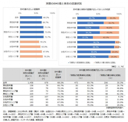 一方で「BMI値と体形の認識が正しくない人」(n=679)のうち、「実際より肥満傾向と認識」にあてはまるのは、実際のBMI値が18.5未満の回答者で自身の体形について「痩せている」の設問に「問題ない」、または「肥満」の設問に「ややあてはまる」「あてはまる」と回答した人、あるいはBMI値が18.5以上25未満で自身の体形について「肥満」の設問に「ややあてはまる」「あてはまる」と回答した人であり、69.7%(n=473)を占めた。