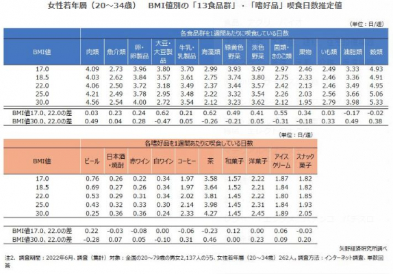 女性若年層(20~34歳)の「13食品群」喫食日数をみると、BMI値17(低体重)の人はBMI値22(普通体重)の人よりも「大豆・大豆製品」「海藻類」「菌類・きのこ類」などを多く食べているという結果になった。また、「嗜好品」喫食日数ではBMI値が低い人と高い人で大きな差を確認できないが、「ビール」はBMI値が低い人ほど1週間あたりの飲酒日数が多い結果となった。