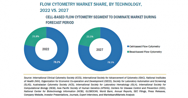 フローサイトメトリーの市場規模は、2022年の47億米ドルからCAGR8.1%で成長し、2027年には69億米ドルに達すると予測されています。同市場の成長は、HIV/AIDSや癌の有病率の上昇、研究活動におけるフローサイトメトリー技術の採用拡大、免疫学および免疫腫瘍学研究における官民合同の取り組みの増加、フローサイトメトリーソフトウェアの技術的進歩の上昇が要因となっています。