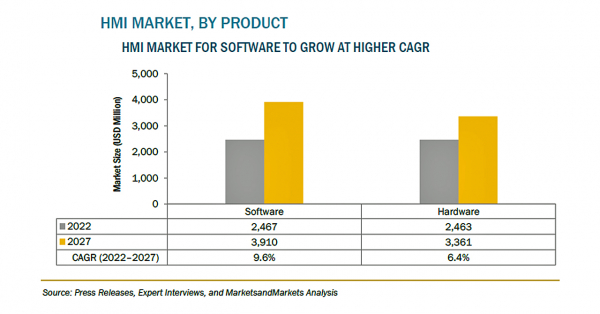 ヒューマンマシンインターフェース(HMI)の市場規模は、2022年の49億米ドルからCAGR8.1%で成長し、2027年には73億米ドルに達すると予測されています。製造プロセスにおける産業用オートメーションの採用が進み、リアルタイムのデータ分析が重視されるようになったことが、HMI市場の成長を促進する主な要因となっています。さらに、安全コンプライアンス自動化ソリューションの需要が高まっていることも、同市場の成長を支えています。