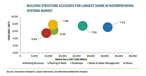防水システムの市場規模は、2022年の613億米ドルからCAGR7.0%で成長し、2027年には859億米ドルに達すると予測されています。公共インフラへの投資拡大とともに、建設業界では費用対効果の高い効率的な防水システムの需要が高まっており、同市場の成長を牽引しています。