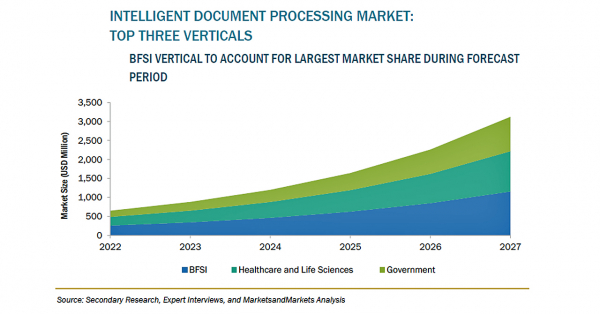 高度文書処理(IDP)の市場規模は、2022年の11億米ドルからCAGR37.5%で成長し、2027年には52億米ドルに達すると予測されています。大量の構造化・非構造化文書を正確かつ迅速に処理したいという企業ニーズの高まりが、同市場の成長を促す要因となっています。