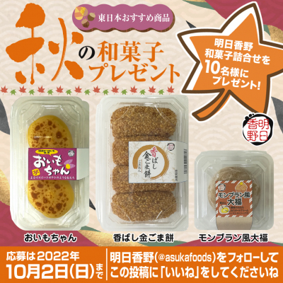 今回のキャンペーンでは東日本10月の新商品、スイートポテトのような餅「おいもちゃん」のほか、黒ごまあんを包んだ餅に、金ごまをたっぷりまぶした「香ばし金ごま餅」、栗あんを餅生地で包んでモンブラン風にした「モンブラン風大福」をセットにして10名様にプレゼントいたします。