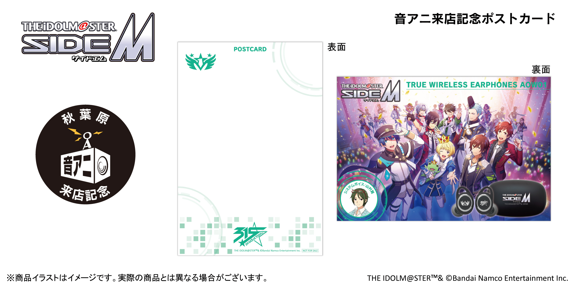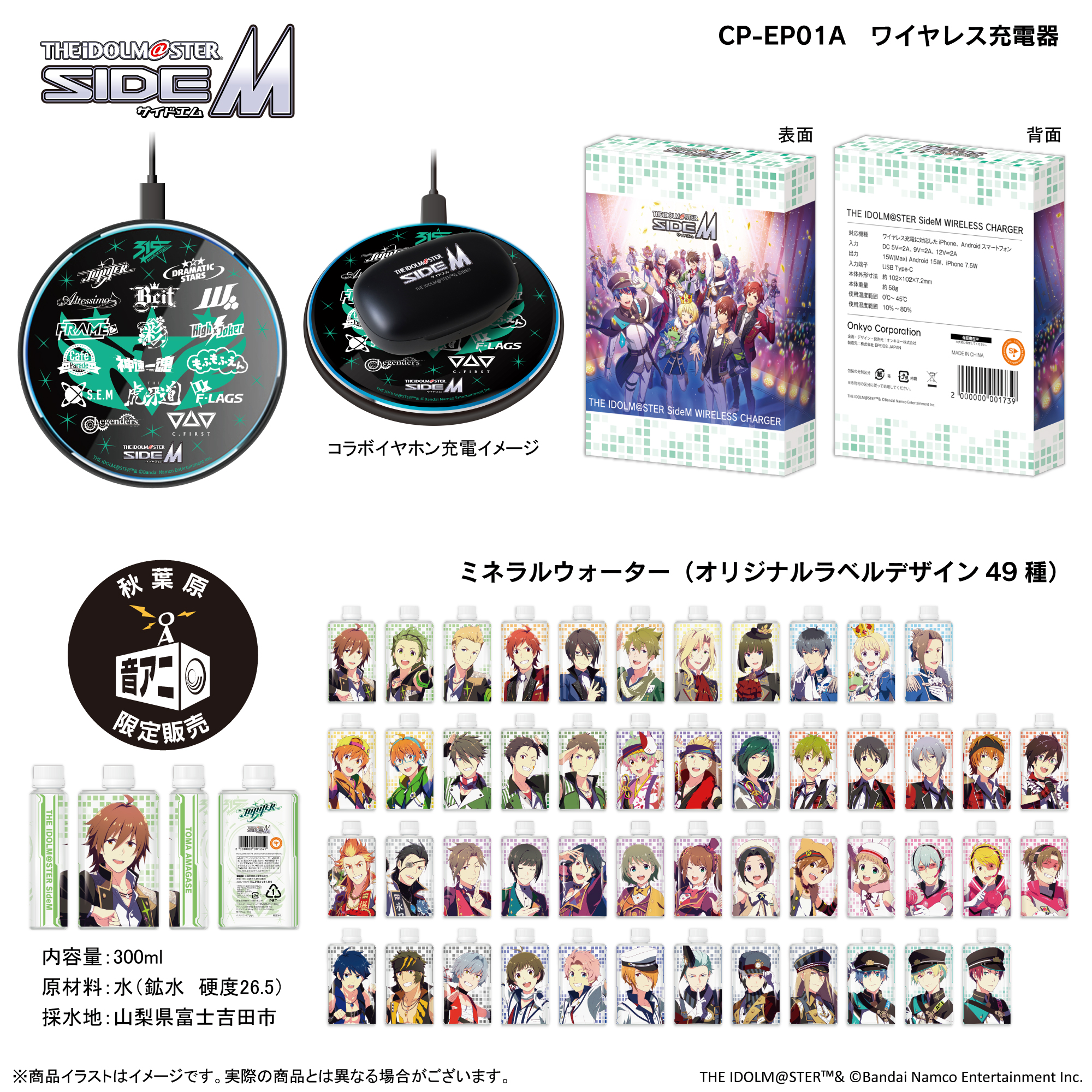 尚、『THE IDOLM@STER SideM』のその他のグッズとして「ワイヤレス充電器(1種類)」「ミネラルウォーター(49種類)」を販売致します。「ワイヤレス充電器」は、通販サイト「ONKYO DIRECT」、秋葉原店舗「音アニ」ともに、9月30日(金)15:00~販売開始、「ミネラルウォーター」は、10月中旬の販売を予定しています。販売時期が決まり次第、下記SNSにてご案内致します。