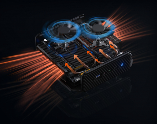 内部には冷却用のデュアルファンを搭載しています。放熱性をさらに向上、重めなゲームや、マルチ作業など全負荷時でも、過熱状況を防ぎ、低騒音で動作し、安定できます。