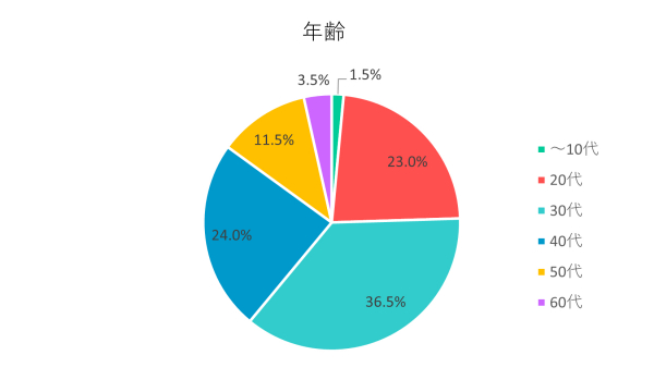 「10代以下」は1.5%(3人)、「20代」は23%(46人)、「30代」は36.5%(73人)、「40代」は24%(48人)、「50代」は11.5%(23人)、「60代」は3.5%(7人)でした。