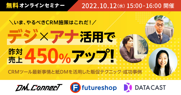 “おもてなしを科学する”株式会社イー・エージェンシー(本社:東京都千代田区、代表取締役:甲斐真樹)は、株式会社JPメディアダイレクト(本社:東京都港区、代表取締役CEO:中島直樹)および株式会社フューチャーショップ(本社:大阪府大阪市、代表取締役:星野裕子)と共催で、2022年10月12日(水)にオンラインセミナー『いま、やるべきCRM施策はこれだ!「デジ×アナ」活用で昨対売上450%アップ!CRMツール最新事情と紙DMを活用した販促テクニック・成功事例 大公開セミナー』を開催いたします。