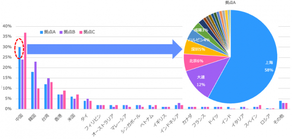 コロナ前までは国や地域の範囲までしか把握できませんでしたが、いい日旅立ちでは「都市」まで分かるようになりました!(現在はアメリカ、中国、韓国、台湾の都市分析が可能です)。例えば、中国からの訪日客が多いある拠点では、上海が半数を超えており、次いで大連、北京となっており、よりきめの細かい越境マーケティングが可能になります。
