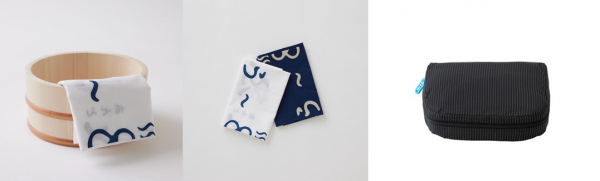 「オーガナイザー」は、XSサイズでわずか10gという超軽量。撥水機能付きで、濡れた荷物を入れても安心。また「おふろ手ぬぐい」は『注染』染めでロゴを表現。最高級手ぬぐい生地使用で、使い込むほどに柔らかな肌触りになるという優れモノです。