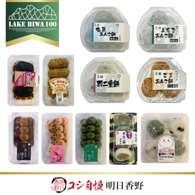 明日香野が提供予定の和菓子は、大人も満足できる大人の団子シリーズから「みたらし団子」、「えびごま塩」、「のりごま塩」、9、10月の人気商品「磯辺餅」、「香ばし金ごま餅」、「羽二重餅」、コシ自慢明日香野の看板商品あんこ餅シリーズ「焼きあんこ餅」、「豆・よもぎあんこ餅」、「よもぎあんこ餅」、「塩豆あんこ餅」、「ごまあんこ餅」など多数になります。