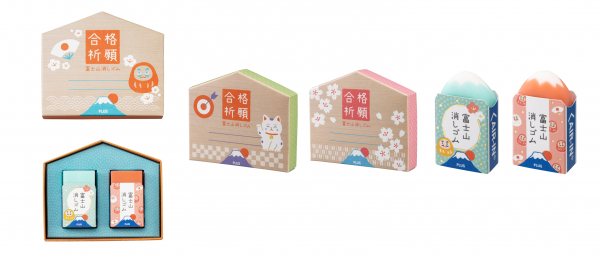 絵馬型のボックスは招き猫、だるま、さくらの3種類のモチーフと縁起の良い和柄をあしらった合格祈願にぴったりのデザインです。消しゴム本体の樹脂色は新色の「薄紅富士(うすべにふじ)」と「薄青富士(うすあおふじ)」の2色で、ケースのデザインは計6柄。2柄(2色)をセットにした小箱入りでの販売です。ボックスには応援メッセージを書き込める大きめのメッセージ欄があり、プレゼントとしてはもちろん、受験生ご自身の願掛け用としてもご使用いただけます。メーカー希望小売価格は660円(税込)です。