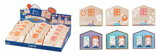 招き猫、だるま、さくらのモチーフに各2色のデザインで計6柄のケース展開。消しゴム本体の樹脂も本企画オリジナルの新色で、華やかながらも落ち着いた色合いの「薄紅富士」と「薄青富士」の2色セット。さらに成功の象徴でもある金色の箔押しでモチベーションアップに!受験生の“もう一歩”の気持ちを後押しします。