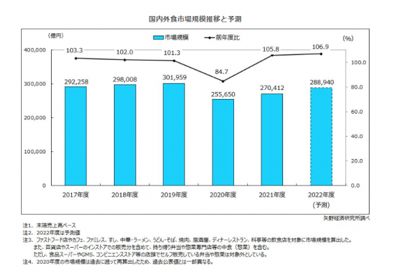 2022年度の外食市場規模は前年度比6.9%増の28兆8,940億円になると予測する。参入企業各社ともコロナ禍を背景とした施策を進めており、テイクアウトおよびデリバリー需要を取り込む洋風ファストフードや強化する和風ファストフードに加え、ファミリー層が低価格で気軽に利用できる回転すし業態など店内飲食も徐々に回復していくものとみられ、また、他業態では大幅減からの反動増も期待出来る見込みである。外食産業各社は抜本的な見直しを進め、売上高が減少しても収益を確保出来るようなビジネスモデルの構築に取り組んでいる。