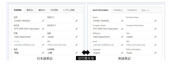 Salesforce Web UIおよびiOS/Android OS版専用アプリの英語表記に対応。ユーザごとに表示言語(日本語/英語)を切り替えてご利用いただけます。