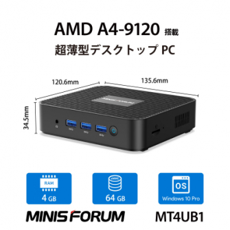 MINISFORUM MT4UB1は、デュアルコアCPU、AMD A4-9120を搭載した超小型のデスクトップパソコンです。4GBメインメモリ、64GB eMMCストレージを搭載したバリューモデルでありながらHDMI 1.4を2つ、有線Gigabit LANポートを2つ備え、モニター裏に固定できるVESAマウンタが付属します。