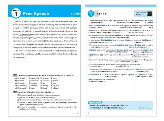 大学入試に近い形式の語彙チェック問題・内容理解問題と、同じ英文を使った〈スラッシュリーディング・リスニング〉やライティングのトレーニングに同時に取り組むことができます。実践的な語彙力とともに、入試で必要になる長文読解やリスニング、さらには英作文の力も効率よく伸ばすことができます。