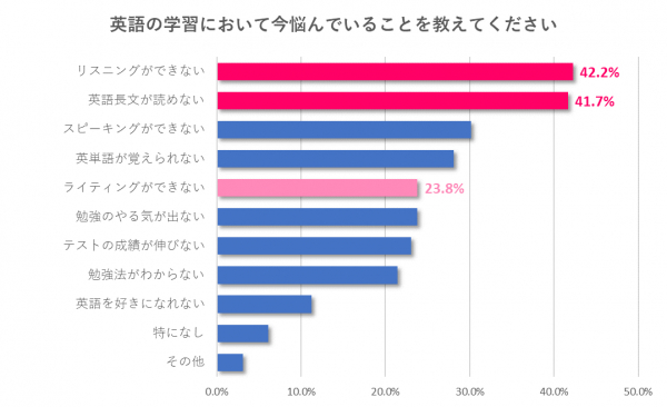 刊行に先駆け、旺文社では大学受験生を対象に、英語学習の悩みに関するアンケート調査を実施しました。回答集計の結果、「リスニングができない」(42.2%)・「英語長文が読めない」(41.7%)の2点がいずれも回答比率4割以上となり、その他の項目に大きな差をつけました。「ライティングができない」(23.8%)も一定数の割合で、受験生の悩みの種となっています。