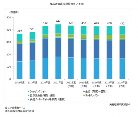 値上げで消費者の節約志向が強まっていることもあり、お得感のある商品の需要は底堅いものの、2022年度の食品通販市場規模は前年度比2.4%減の4兆3,374億円と縮小に転じると予測する。