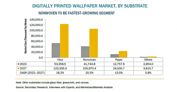 ペイントおよびコーティングのような代替品の増加は、デジタル印刷壁紙市場の成長を妨げる可能性があります。様々な塗料・コーティングメーカーが、環境に優しく、耐腐食性、耐水性、耐熱性、防水性に優れた製品を開発しています。Asian Paints、PPG Industries、Sherwin-Williams、Berger Paints、AkzoNobelなどの企業が販売する塗料は、その性能向上などにより、複数年の耐腐食保証を付けて販売促進を行っており、さらに、性能を向上させるために、メーカーは環境に配慮した新製品を継続的に市場に投入しています。新技術の導入により塗料の性能が向上していることで、デジタル印刷された壁紙への移行を制限している可能性があります。