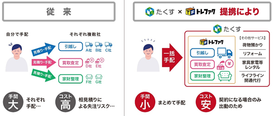住み替え時に必要な「引っ越し」「不用品買取」「家財整理」などの手続きを「たくす」利用により一本化できるため、お客様の負担が大幅に軽減されます。住み替えのハードルが下がることにより、住み替える人が増えれば空き家の減少に繋がります。