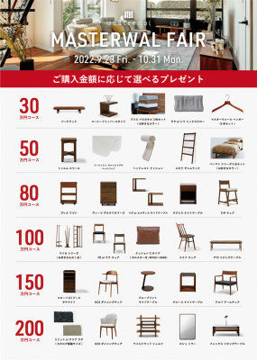 THE COVER NIPPONでは、期間中にマスターウォールの家具をご購入いただくと、ご購入金額に応じたプレゼントが選べる「マスターウォール フェア」を開催しております。