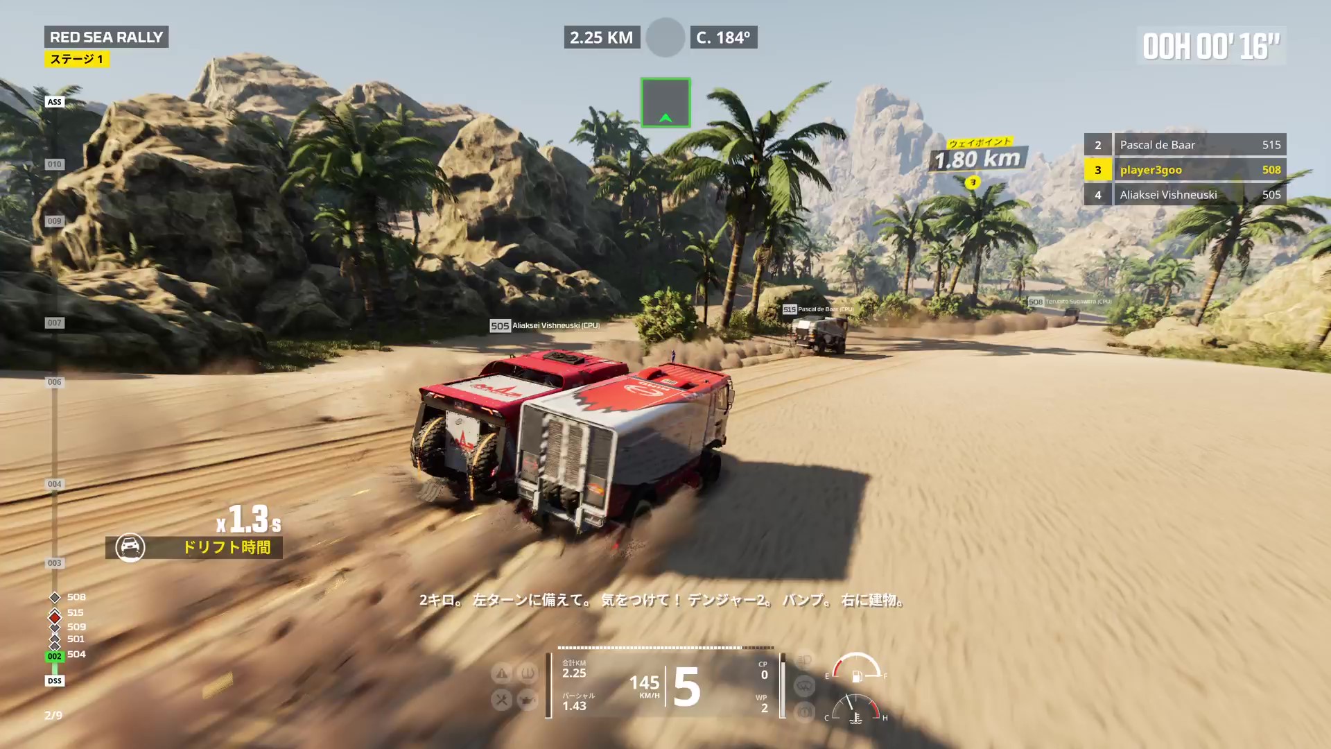 『WRC10 FIA世界ラリー選手権』で非常に好評を得たコ・ドライバーの日本語音声を本作でも採用。日本語による分かりやすいナビゲーションで、砂漠や、湿地、山岳地帯など、行く手をはばむ様々な困難を伝え、荒野を共に走る頼れる相棒が走行をサポートします。