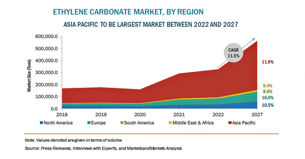 エチレンカーボネートの市場規模は、2022年の4億7300万米ドルからCAGR13.7%で成長し、2027年には9億100万米ドルに達すると予測されています。エチレンカーボネートの需要は、主にリチウム電池の電解液や潤滑油の用途で拡大しています。