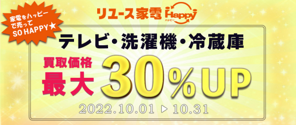 今回の “秋の割増買取キャンペーン”は、9月1日に実施したリユース家電Happyのリブランディングを記念しての「買取強化キャンぺーン第2弾」となります。冷蔵庫、洗濯機、液晶テレビを対象に、通常の買取価格の30%アップで買取をさせて頂きます。今回は特に年式の縛りなどなく、10年以内に製造の物であれば全て30%アップ買取の対象となります。さらに出張料が無料となる特典も付いています。(詳しくは下記キャンペーンURLをご参照ください。)