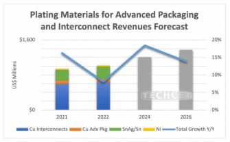 TECHCET (チップ製造業者および材料サプライヤーにビジネスおよび技術情報を提供する電子材料顧問会社) は、2022年のIC電解めっき(金属めっき薬品)総収益が8.1%増の10億1,900万米ドルに達すると予測している。