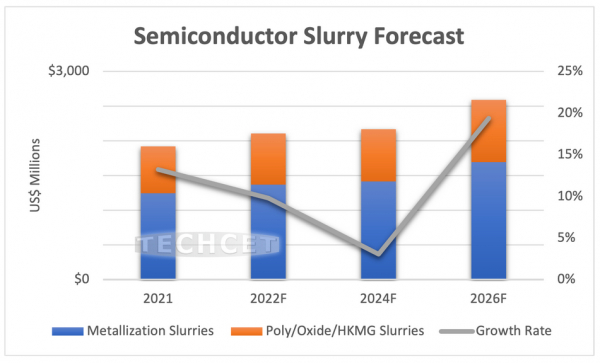 TECHCETは、半導体向けCMPスラリー市場が2022年に前年比約9%成長すると予測している。同社の最新レポート「半導体向けCMP(化学機械平坦化)市場 2022:スラリーとパッド」で強調されているように、スラリー市場全体は今年度20億米ドルを超え、2026年には26億米ドルに達する見込みである。予測期間中に最も強く成長するのは、ポリシリコン、新金属(ルテニウム、コバルト、モリブデン、ジルコニウムなど)、酸化物(セリア)である。