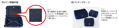 飛行機柄の生地を使用し、ファスナーや荷物固定ベルトはANAをイメージしたブルーで差し色に。