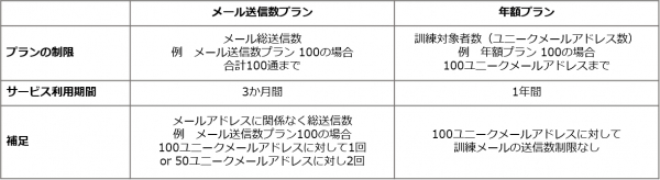 「メール送信数プラン」は、標的型攻撃メール対する現状把握や定期的に1回の訓練を実施する企業や組織のニーズに対応したコストを抑えたプランです。「年額プラン」は、通常のメールに紛れこませるなど不定期に複数回の訓練を実施し、標的型攻撃メールに対して耐性の強化を図る企業や組織のニーズに対応した最適なプランです。