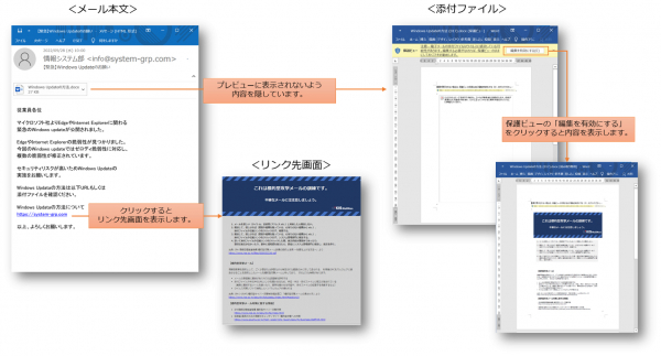 訓練シナリオギャラリーは、代表的なEmotetを模した添付ファイル型、URLリンク型(フィッシング型)、