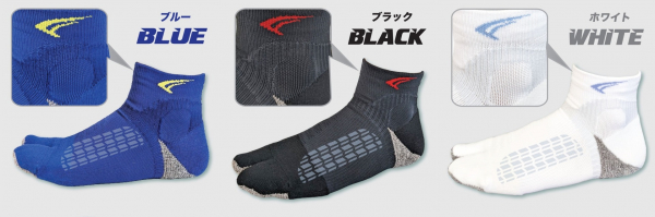 つま先がタビ形状になっているソックスは親指が独立している為、指先に力が入れやすくスィング動作時に踏ん張りが効きやすい特徴があります。また、荷重のかかる母趾球から指先、かかと部分にピンポイントでクッションパイルを配置しました。一方、クッションパイル部以外は薄地に切り替え、必要な部分にメッシュ部を配置することで暑苦しい印象はありません。さらに、擦れて破れやすい部位に特別な補強構造を施しています。素材には、抗菌防臭・吸水性・高摩擦などの機能素材を使用する事で、当社従来品ソックスの悩みを改善しました。