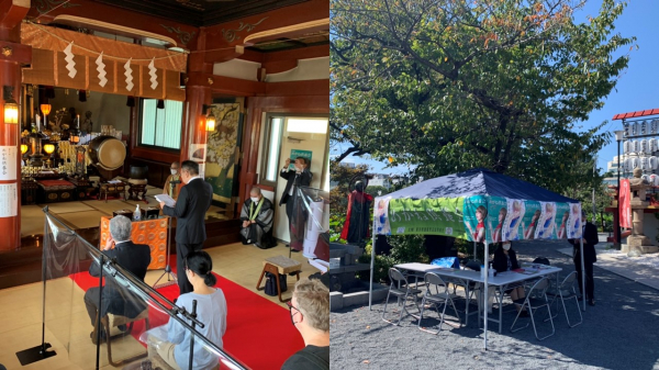 当日は、午前9時から、一般の方の供養ご希望メガネの受付を開始。使わなくなったが想いの詰まったメガネを承り、「ご氏名」とメガネへの「ひとこと」を記載できる白封筒に封入しご供養しました。またイベントとしての側面から、ご来場者には、特典の「オリジナルめがね拭き」や同日開催で今回協力を仰いだ福井県鯖江の『めがねフェス 2022』パンフレットなどを配付して、“メガネの日”イベントの啓発にも取り組みました。午後12時からは、本堂で寄せられたメガネを前にした供養(読経)を開始。いまだコロナ禍である事を留意して、列席者は組合関係者15名のみで執り行われました。この日寄せられたメガネは約300本。事前受付で寄せられていたメガネと合わせて約1,300本のメガネを供養し、閉会となりました。