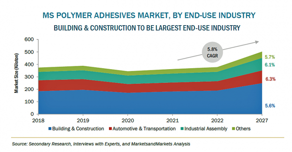 MSポリマー接着剤の市場規模は、2021年の52億米ドルからCAGR6.1%で成長し、2027年には75億米ドルに達すると予測されています。次世代接着剤およびシーラントとして、顧客のニーズに合わせてカスタマイズされた幅広いソリューションが導入されています。メーカーは、さまざまな接着剤接合技術を組み合わせる研究開発に多大な投資を行っています。これらの組み合わせで開発されたハイブリッド接着剤は、その製造に使用される樹脂の特性を持ちます。高性能なハイブリッド接着剤やシーラントを製造するためのMSポリマーのようなハイブリッド樹脂の開発は、市場の牽引役として重要な役割を担っています。