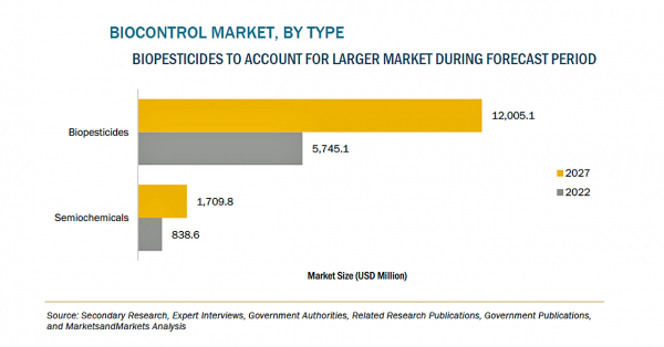 バイオコントロールの市場規模は、2022年の66億米ドルからCAGR15.8%で成長し、2027年には137億米ドルに達すると予測されています。バイオコントロールは、生物農薬や半化学物質など、天然由来の作物保護剤で、微生物、生化学、大腸菌などの天然資源に由来しています。従来の農薬は、環境と人々の健康の両方に有害であり、そのため、北米と欧州を中心とした地域では、食の安全、安心、環境の持続可能性を保証するために、農薬の規制を進めています。有機食品に対する消費者の意識と需要は、ともに急上昇しています。このような要因が複合的に作用して、バイオコントロール市場は活性化しています。