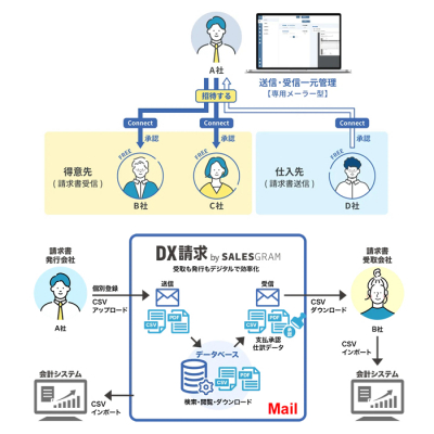 「DX請求 by SALESGRAM」は、SNSと電子メール技術を応用した請求書の発行&受取の両方を行えるまったく新しい仕組みです(システム特許申請済)。請求書(PDF)と電子データ(CSV)の両方を専用メーラーで送受信し、さらに請求書(PDF)をデータベース保存できる仕組み(プラットフォーム)で、改正電子帳簿保存法&インボイス制度対応を簡単に実現した業界初のAll電子システムです。