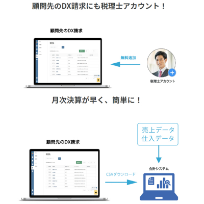 税理士・会計事務所様は有料のProプラン(月額20,000円)が0円(無料)でご利用いただけます。このサービスは、税理士・会計士が便利なユーザー体験を顧問先企業に伝えていただくことを目的としています。さらに顧問先企業が「DX請求 by SALESGRAM」を利用した場合、顧問先アカウントに対して、「税理士アカウント」の無料発行も可能となります。これにより、顧問先企業が送信、受信した電子請求書を税理士がオンラインで確認して、仕訳データをCSVダウンロードして会計システムに一括登録が可能となり、業務効率が圧倒的に改善され、月次決算期間が短縮されます。
