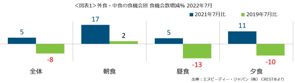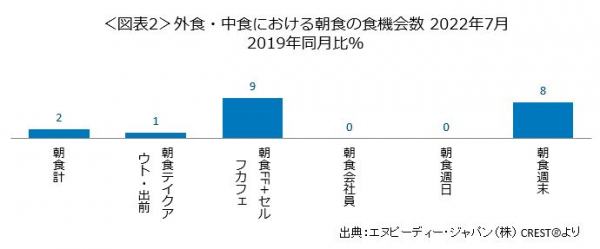 外食・中食全体の食機会数は、2022年7月に2019年同月比8%減でしたが、朝食は、前年同月比で17%増と大きく回復し、2019年同月比では2%増と、コロナ前の水準を上回りました(図表1)。