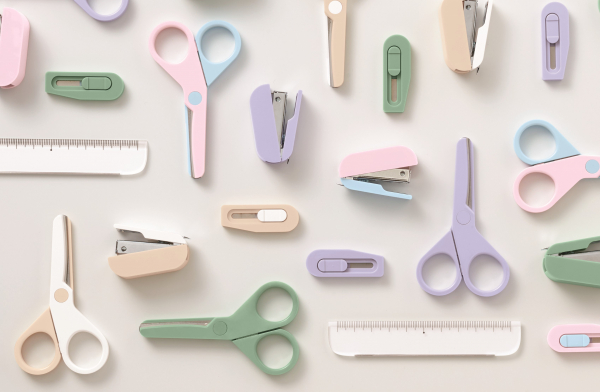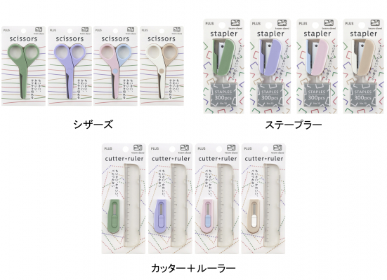 本体は、セット品とは異なるオリジナルカラーを採用。Z世代*から幅広い支持があるくすみカラーの「わかば」「ふじ」、楽しいバイカラーの「もも」「くるみ」の全4色のラインアップです。メーカー希望小売価格(税込)は、「シザーズ」660円、「ステープラー」693円、「カッター+ルーラー」550円です。