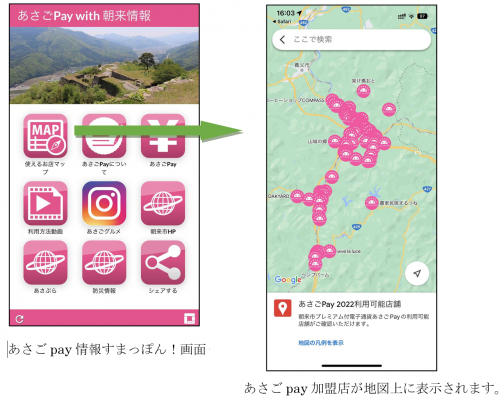 利用者は、スマートフォン用アプリ「Pokepay」をアプリストアからダウンロードし、アプリ内に「あさごPay」を追加、クレジットカードや商工会事務所で現金を渡しチャージし、市内の加盟店で支払いに利用できます。