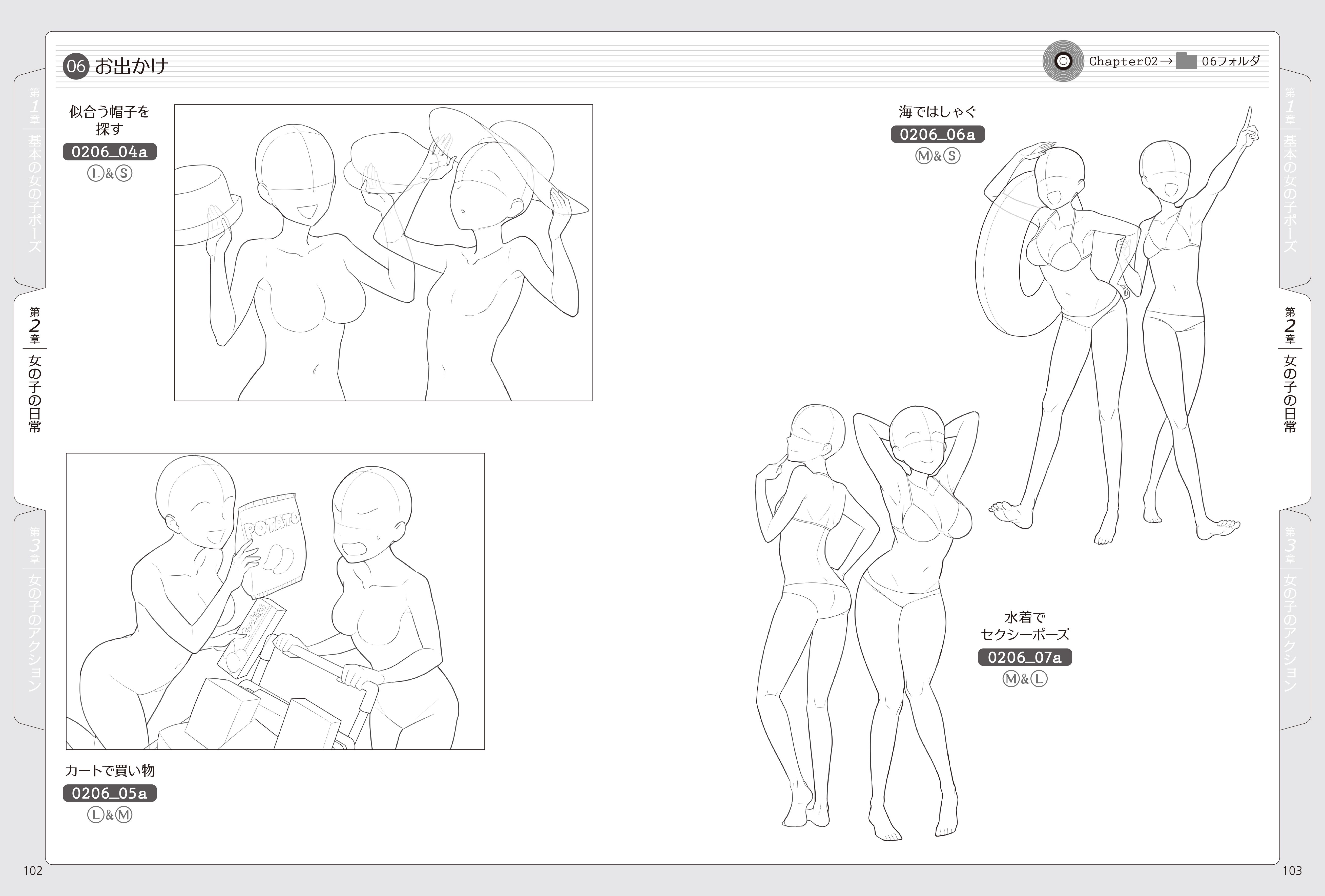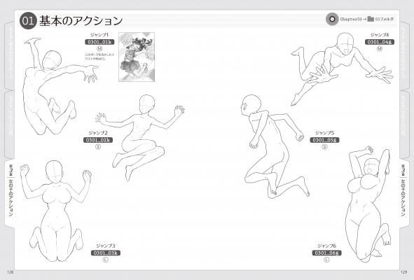 立ち姿や座り姿などの基本ポーズ、日常生活のポーズ、ジャンプ・ダッシュや戦闘シーンなどのアクションまで幅広く掲載します。